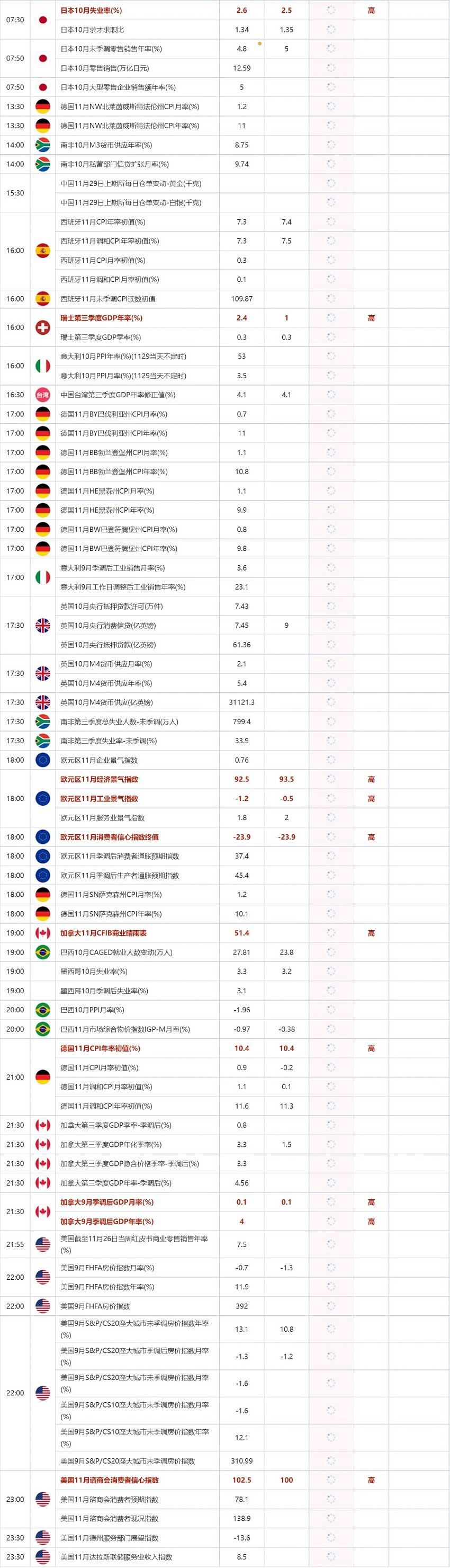 11月29日,投资者需要关注的重点数据:日本10月失业率?,欧元区11月经济景气指数,欧元区11月工业景气指数,欧元区11月消费者信心指数终值,德国11月CPI年率初值,加拿大9月季调后GDP月率,美国11月谘商会消费者信心指数。?需要关注的大事件包括欧洲央行副行长金多斯发表讲话,?英国央行货币政策委员曼恩发表讲话,英国央行行长贝利在上议院做证词陈述。